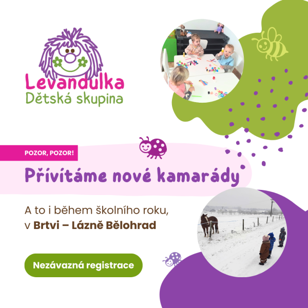 V malebné obci Brtvi u Lázní Bělohrad, uprostřed čisté a klidné přírody Podzvičinska, jsme vytvořili jedinečný prostor pro ty nejmenší – dětskou skupinku Levandulka. Místo, kde každý den začíná s úsměvem, probíhá v bezpečí a končí se zážitky, které si děti nesou v srdci.